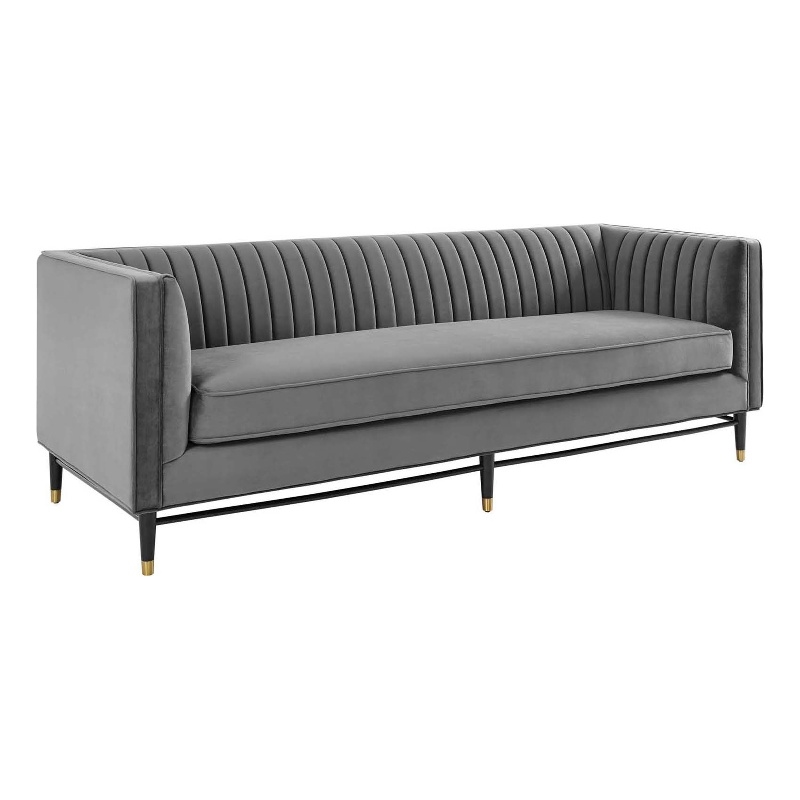 Introduce the flowing lines of the Devote Channel Tufted Performance Velvet Sofa to your living room, bedroom, or office decor. Putting a retro twist on classic tufting, this sofa is enriched with vertical channel tufting that adds visual depth and glam deco style to any space. This living room sofa is upholstered in stain-resistant performance velvet and padded in dense foam for a premium seating experience. Durably crafted, this sofa rests atop black rubberwood legs with gold stainless steel sleeves that add subtle interest. Includes non-marking foot caps. Assembly required.